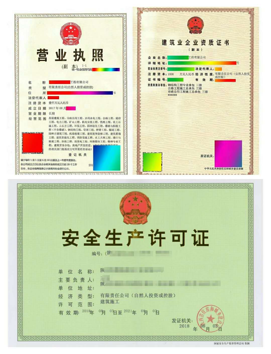 | 资质详情 | 营业执照:2017年08月01日成立,开户许可证:2017年09月19日,资质:2018年04月09日,安许证:2018年08月03日;公司社保一直有一人参保缴费,社保已经年审通过。 | ||||