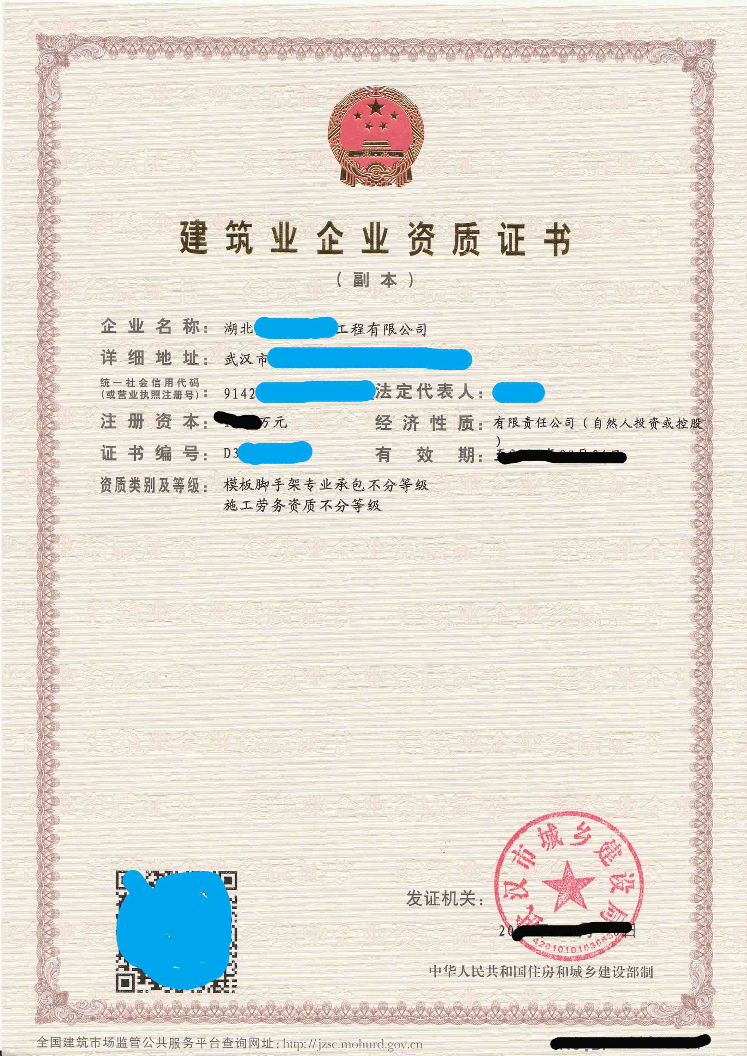 | 资质详情 | 劳务施工资质,模板工程专业承包资质 | ||||