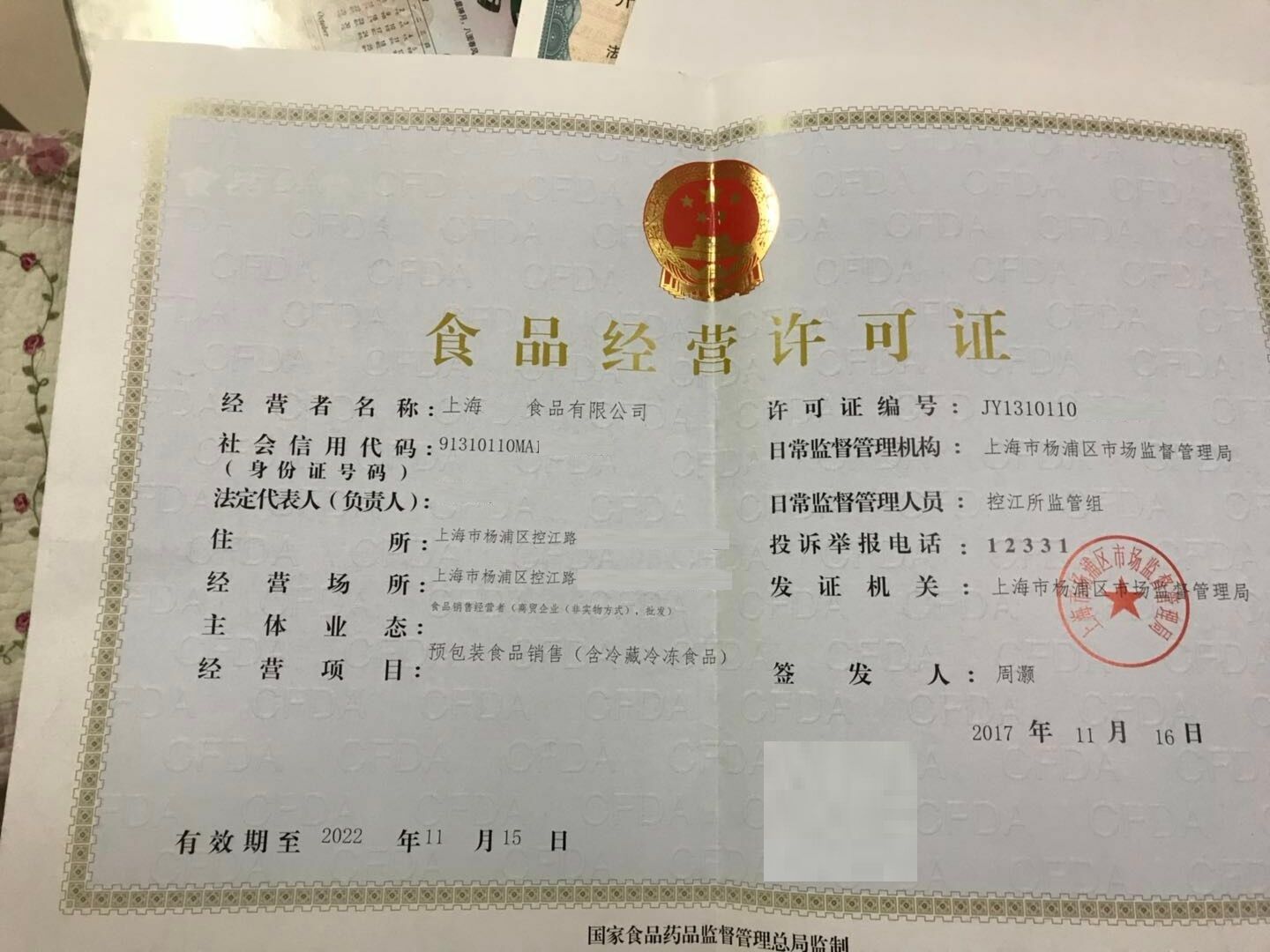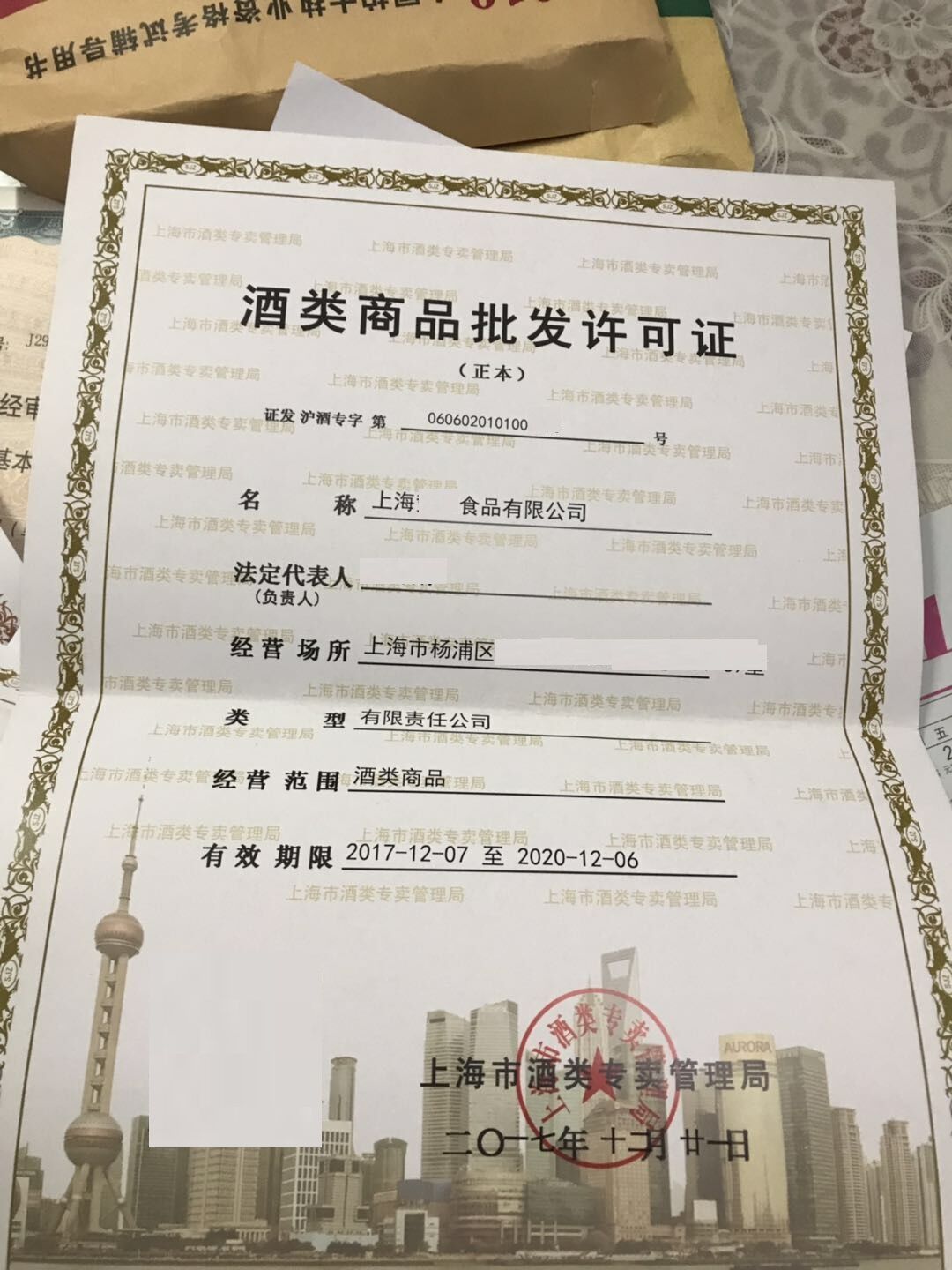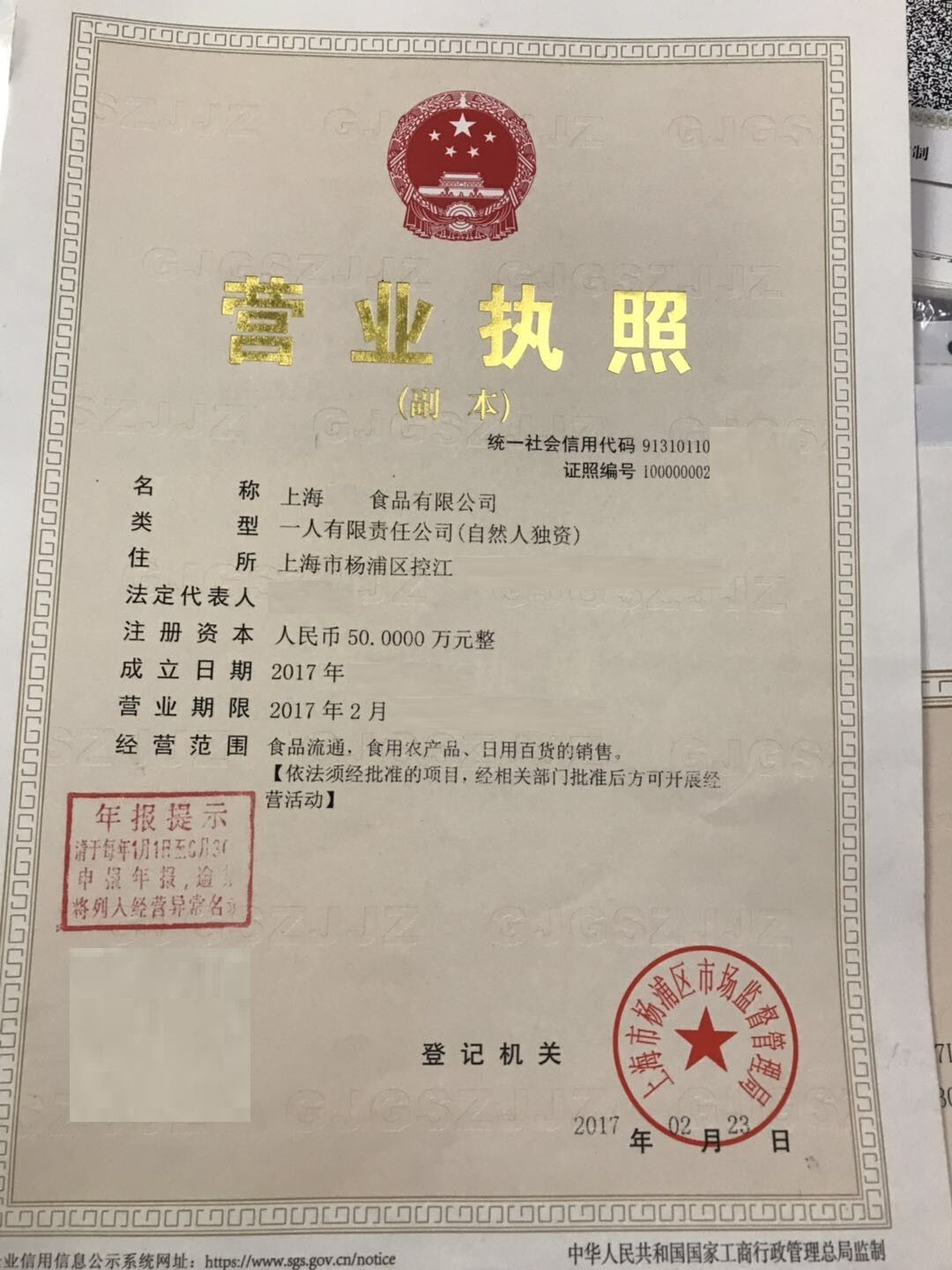 | 企业名称 | XX上海杨浦食品公司+食品许可证+酒类许可证 | 成立时间 | 2017-02-17 | 行业分类 | 贸易类 |